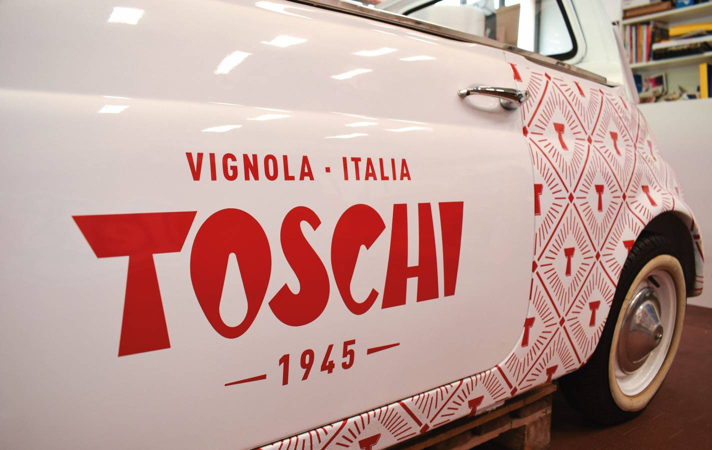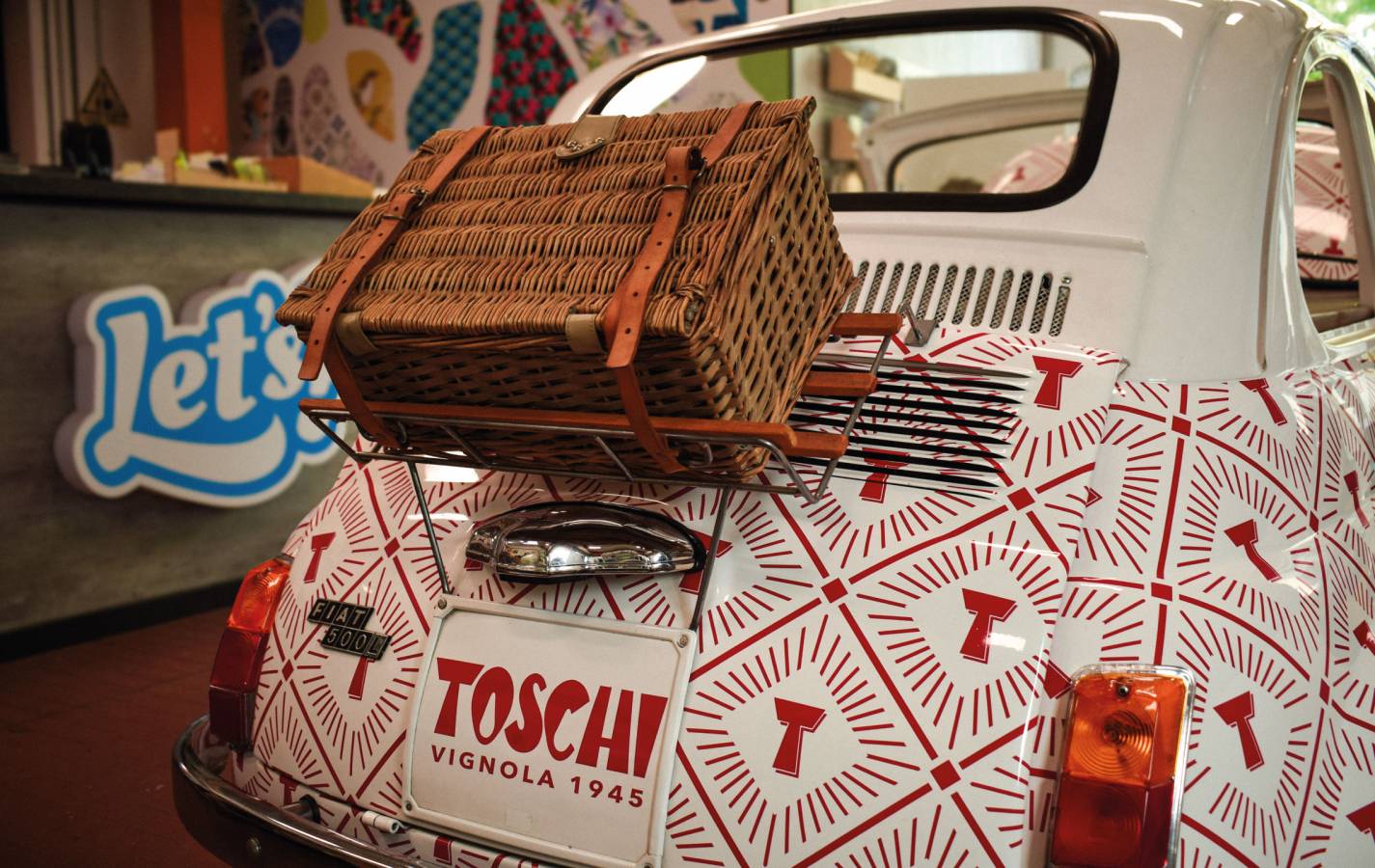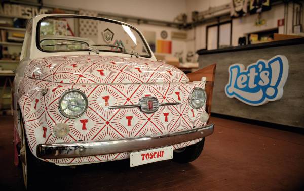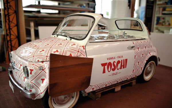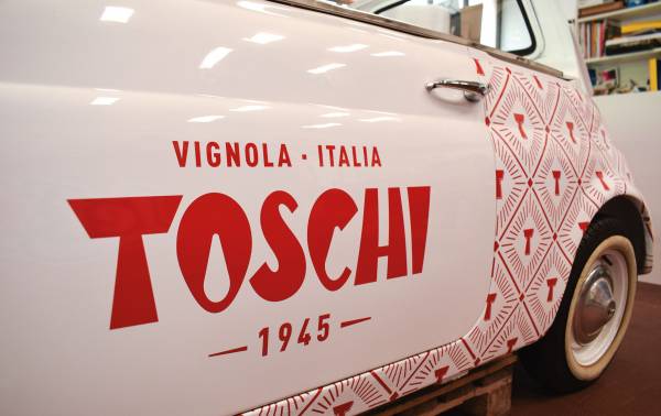 La storica Fiat 500 unicamente decorata con l'elegante pattern di Toschi Vignola Srl..qui la "dolce vita" incontra il gusto..ed ora, pronti, partenza,via!